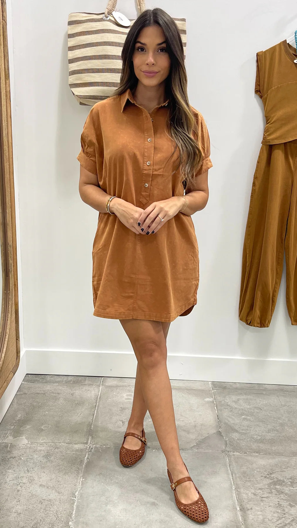 Harper Mini Shirt Dress blends comfort and style with ease. Designed in a soft clay hue, she features a collared neckline, half-button placket, and gathered short sleeves with button tabs for subtle detail. Side pockets add everyday practicality, while her relaxed silhouette and curved hem create a casual, lived-in vibe—perfect for versatile, effortless wear.